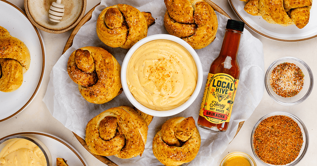 We’re excited to share that we’ve partnered with our friends at Rodelle to create a mouthwatering new concoction: Spicy Sriracha Pretzels with Cheddar Cheese Sauce. And the recipe isn’t the only thing that’s new. The ingredients include our new Local Hive Sriracha Honey Hot Sauce and the new Rodelle Sriracha Seasoning.