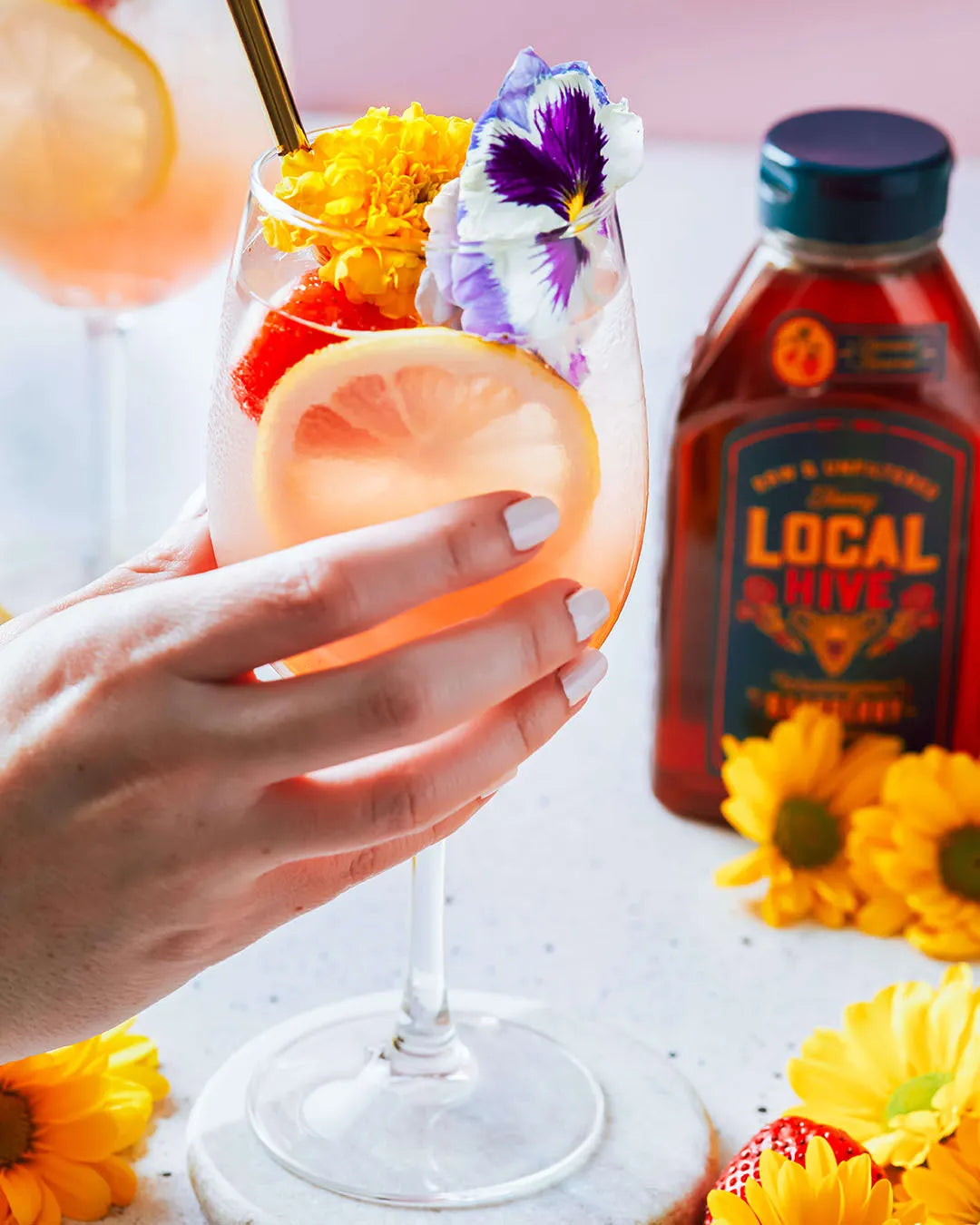 If you're a fan of grapefruit, the Citrus Honey Paloma is a drink you won't want to miss. Featuring Local Hive Honey's Cali Citrus Blossom varietal, grapefruit juice, tequila, lime juice, lemon juice, and a splash of lime seltzer, this cocktail is a perfect balance of tart and sweet. The salt rim and garnish of grapefruit and thyme add an extra touch of sweetness to this summer delight.